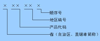 四、生產(chǎn)登記批準(zhǔn)書采用全國可識(shí)別的編號(hào)方法,由省(自治區(qū)、直轄市)簡稱、產(chǎn)品代號(hào)、地區(qū)編號(hào)、順序號(hào)組成,如下圖所示: